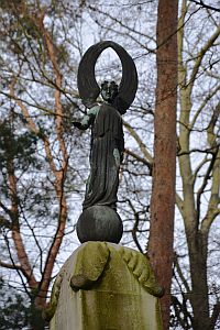 Sockel in einer Rasenfläche. Oben ist ein kleiner Bronze-Engel, auf einer Kugel stehend, angebracht. Dahinter befindet