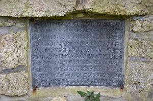 sich eine dreiseitige Bruchsteinmauer, an der zwölf Metalltafeln mit den Namen der Gefallenen und Vermissten angebracht