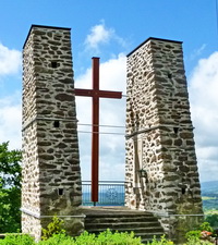 konisch zulaufende Säulen, verbunden mit einem Holzkreuz und Metallgeländer auf einem Hügel