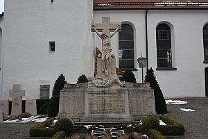 Im Friedhof Denkmal, oben Kreuz mit Heiland, darunter liegender Soldat; zusätzlich Hinweise zu Soldaten von privaten