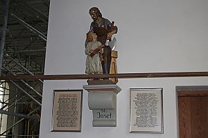 In der Kirche zwei Gedenktafeln an der Wand, dazwischen Skulpur vom St. Josef