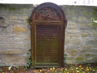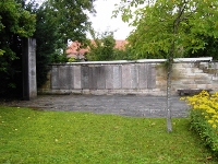 Kirche, Steinmauer mit zwölf Steintafeln der im 1. und 2. Weltkrieg gefallenen Krieg 1870/71 eine