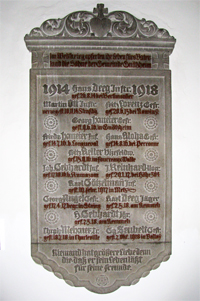 In Weltkrieg opferten ihr Leben fürs Vaterland die Söhne der Gemeinde Gnötzheim (Namen) Niemand hat größere Liebe denn die, daß er sein Leben läßt für seine Freunde.