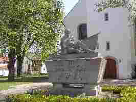 Vor der Kirche; ein grosser Sarkophag mit einem sitzenden trauernden Soldaten, der eine gesenkte Fahne hält. Rundum stehen die Namen der Opfer des 1. u. 2. Weltkrieges, auf der Steinplatte davor die Vermissten des 2. Weltkrieges.