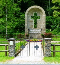 Halbkreisförmige mit Holzzaun eingefriedete Anlage an der Straße im Rechengraben. Im Zentrum muschelförmiges Monument mit ausgesparten Kreuz.