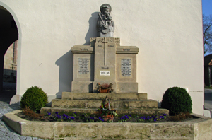 Denkmal neben dem Eingang zum Hof der Wehrkirche Geburt Marines für die Orte Hannberg und Röhrbach.