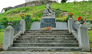 Denkmal auf einem Naturstein als Fundament. Es ist gekrönt mit der Plastik eines liegenden und eines ihm
