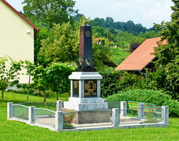 Stele auf quadratischen Sockel gekrönt mit Adler eingefriedet mit Metallzaun und Säulen nahe der Kirche.