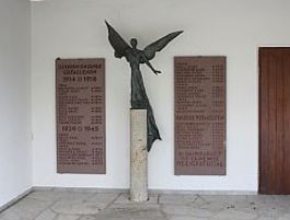 An der Friedhofskapelle; zwei Gedenktafeln an der Wand, dazwischen auf einer schlanken Säule Metallengel;