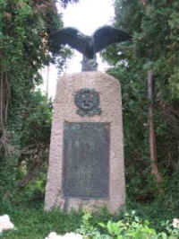 Gegenüber der Kirche. Steinquader, oben mit Adler, vorne Gedenktafel; Hinweistafel am Aufgang zum Denkmal