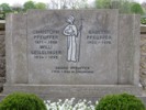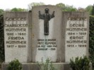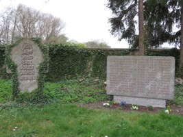 Auf dem Friedhof ein Gedenkstein mit Inschrift, daneben Gedenkstein in Form eines Grabsteines mit Namen