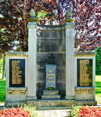 von Namenstafeln flankiert ist steht eine quadratische Säule gekrönt mit Eisernem Kreuz.
