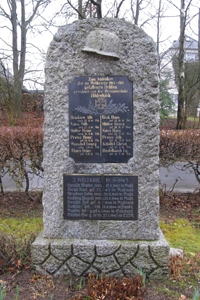 Granitblock mit zwei polierten gravierten Platten für den 1. und 2. Weltkrieg am Dorfplatz im Ortskern
