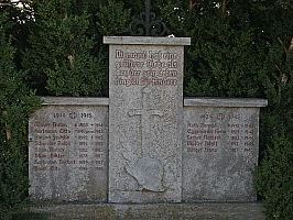 im Friedhof; Gedenkwand, mittlerer Teil erhöht und vorspringen, vorne Steinrelief „Schwert, Helm und Eichenlaub“