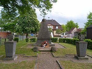 Das Ehrenmal in Form einer Pyramide wurde durch zwei Stelen mit Eisernen Kreuz erweitert, auf denen die Namen der Opfer des Zweiten Weltkrieges zu lesen sind.