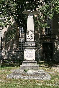 Quadratische Säule vor der Kirche mit aufgesetztem Adler, Namen und Widmung auf dem Sockel (vier Tafeln).