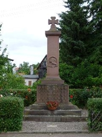 Das Kriegerdenkmal steht auf einen dreistufigen Sockel. Darauf steht ein Sandsteinquader mit einer