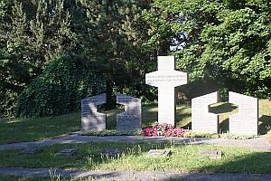 Denkmal im neuen Friedhof: In der Mitte ein Kreuz, seitlich Gedenktafeln, der Zwischenraum bildet jeweils ein Kreuz