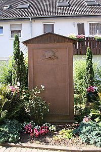 Bei der Kirche; stehende Sandsteinplatte mit Dachabschluss