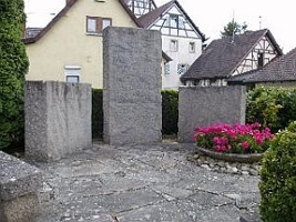 (1. Weltkrieg) bei der Kirche. Drei grob behauene Steinplatten im Einfahrtsbereich zur Altstadt.