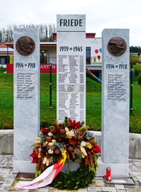 Drei freistehende Marmorsäulen auf einem gemeinsamen Sockel auf den äußeren beiden kreisförmige Bronzereliefs von Soldatenköpfen gegenüber dem Gemeindeamt.