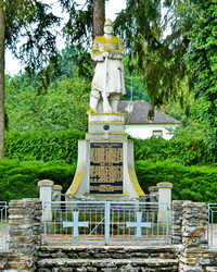 Quadratischer Sockel gekrönt mit der Statue eines Soldaten neben der Kirche eingefriedet mit Ketten und Säulen.