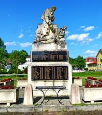 Quadratisches Monument gekrönt mit der Statue eines stehenden und eines liegenden Soldaten eingerahmt von Blumentrögen vor der Kirche.