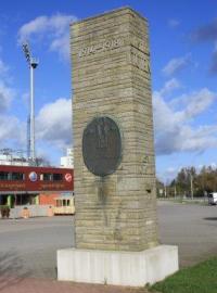 Stele auf einem Sockel auf dem Stadionvorplatz. Bis 2006 stand das Denkmal im Stadion auf den Zuschauerrängen der