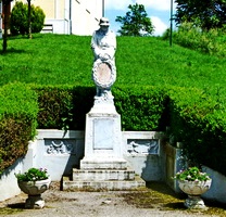 Quadratischer Sockel nahe der Kirche mit der Statue eines Soldaten der eine lorbeerumkränzte Tafel mit beiden Händen hält