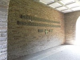 zu 2) Ehrengrabstätte für die Opfer des Zweiten Weltkrieges: In den Jahren 1939 – 1945 starben durch den Krieg an den Fronten und innerhalb der Grenzen unserer Stadt mehr als 4500 Koblenzer Bürger. Zu ihrem Gedächtnis und als Mahnung zum Frieden tragen diese Mauern ihre Namen. Wandspruch: Menschen vergesset uns nicht. Damit wir ins Dunkel nicht sinken. Nur das Licht Eurer Liebe erhellet die einsame Nacht.