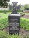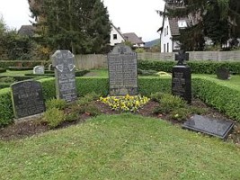 Grabmal mit Eisernen Kreuz (Name ebenfalls auf der Gedenktafel erster Weltkrieg): „Hier ruht in Gott mein lieber Gatte, unser guter Vater, Sohn, Bruder und Schwager…er starb den Heldentod am 26. April 1918 im Lazarett zu Essen in Folge seiner am 17. April erlittenen Verwundung. Der Gattin und den Kindern galt all dein ganzes Streben. Jedoch des Krieges rauhe Hand zerstörte Glück und Leben.“