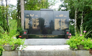Dreiteiliges freistehendes Monument auf einem Sockel neben der Kirche. In der Mitte Abbildung eines stehenden Soldaten der einen Knieenden stützt, rechts und links davon Namenstafeln.