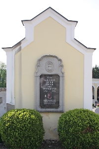 Im Friedhof; Gedenktafel an einer Kapellenwand.