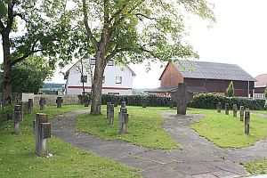 Bei der Friedhofskirche; Steinkreuze rund um ein größeres Steinkreuz; zusätzlich Hinweise zu Soldaten von