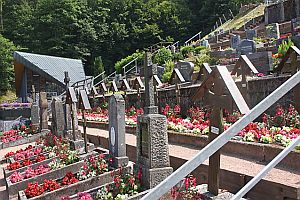 Im Friedhof; zwei Reihen Soldatengräber, zum Teil mit überdachten Holzkreuzen oder