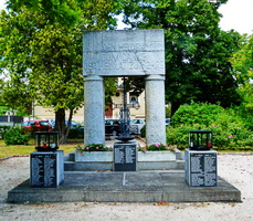Schmiedeeisernes Kreuz flankiert von zwei Steinsäulen die Granitquader tragen in einem kleinen Park Ecke Hofstraße – Jägergasse. Vor dem Denkmal drei Würfel mit Namenstafeln.
