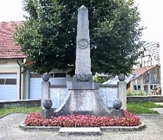 Steinobelisk, seitlich mit eingefügten Namenstafeln. Dahinter eine angefügte Steinwand mit vier