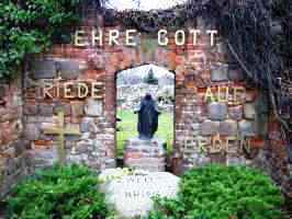 der Kirchenruine, an die Opfer das Zweiten Weltkrieges erinnert. Zwei Kriegsopfer wurden hier bestattet. Die