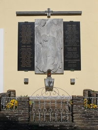 An der Wallfahrtskirche; Gedenktafel aussen an der Wand, Metallplastik „drei Personen“, seitlich davon Namen; zusätzlich Hinweise zu Soldaten von privaten Gedenksteinen