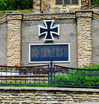 Wandtafel mit Metallrahmen darüber Eisernes Kreuz am Aufgang zur Kirche.
