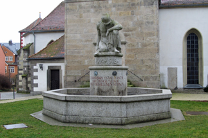 Marktredwitz (Kirche), Landkreis Wunsiedel i.Fichtelgebirge, Oberfranken, BayernPLZ 95615 Der Kriegergedächtnisbrunnen für den 1. Weltkrieg steht vor der evang. luth. Stadtparrkirche St. Batholomäus. Auf dem zweiteiligen Sockel kniet ein trauernder Soldat