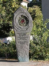 Mengen (kath. Kirche), Landkreis Sigmaringen, Baden-WürttembergPLZ 88512 Bei der kath. Kirche; Metallsäule, oben mit einem bunten „Auge“, Inschriften vorne und hinten