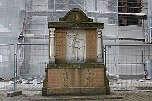 Bei der Kirche; Denkmal, oberer Teil aussen mit zwei runden Säulen geschmückt, in der Mitte Bildrelief