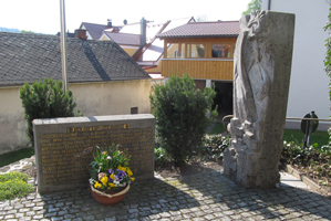 Gravierte Steinstele neben einer Steinskulptur vor der katholischen Pfarrkirche St. Michael im Ortskern.