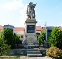 Statue zweier Soldaten vor einem Kreuz auf einem quadratischen Sockel mit