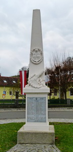 Stele auf quadratischen Sockel mit Relief eines Geschützes am Hauptplatz.