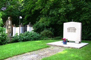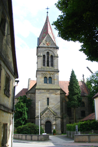 Neuendettelsau (Pfarrkirche St. Nikolai), Landkreis Ansbach, Mittelfranken, BayernPLZ 91564 Bei der evangelischen Pfarrkirche St. Nikolai steht ein Gedenkstein ohne Namen auf einer Grünfläche; daneben eine lebensgroße Soldatenfigur.