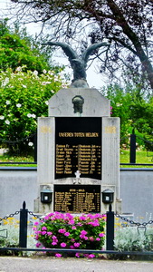 Rechteckiges freistehendes Denkmal gekrönt mit Adler an drei Seiten eingefasst mit abgeschrägten Mauer und eingefriedet mit Ketten und Säulen neben der Kirche.