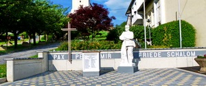 Vor einer rechtwinkeligen niederen Wand, unterhalb der Kirche, beschriftet mit den Worten PAX PEACE MIR FRIEDE SCHALOM steht ein Würfel mit Namenstafeln und daneben die Statue eines auf ein Gewehr gestützten Soldaten.