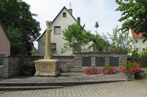 Das Denkmal aus hellem Stein ist halb umrandet von einer dunklen Steinmauer. Namen und Daten für den 1. Weltkrieg sind im Sockel eingeritzt. Darüber eine Säule auf deren Spitze ein Adler sitzt. An der Mauer sind Metalltafeln für den 2. Weltkrieg angebracht.